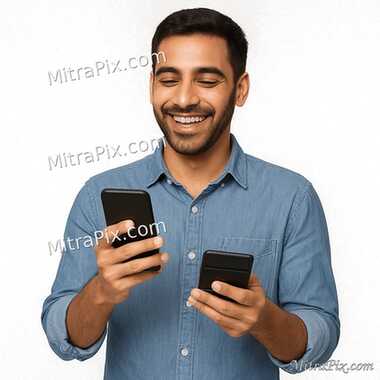 Smiling young man holding two smartphones — modern communication, social media connection,