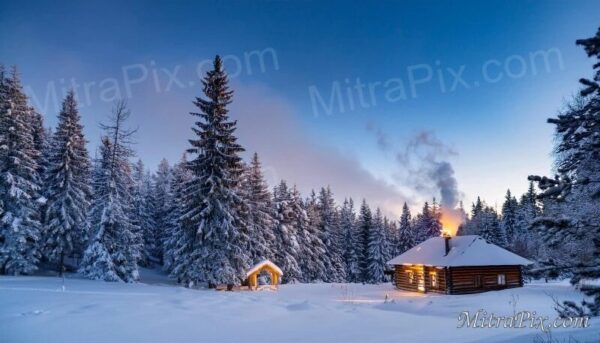 Be the first to review “A winter wonderland with snow covered pine trees, a wooden cabin with smoke rising from the chimn…” Cancel reply